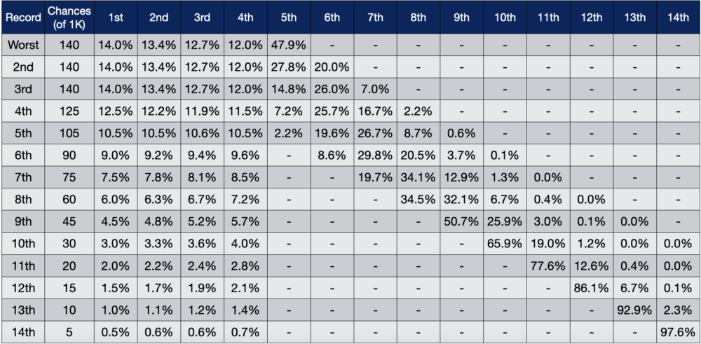 Compounding this team-building and tanking dilemma is the relatively new[ref]The new odds went into effect for the 2019 NBA Draft.[/ref] ‘flattening’ of lottery odds. The worst three teams now share top-choice odds, and teams later in the pecking order all receive a few more bites at the top picks. That also results in the worst three teams having a scant 14% chance at the top pick[ref]The worst team used to have a 25% chance at the top pick.[/ref], and less than 50% to even be in the top three selections at all: