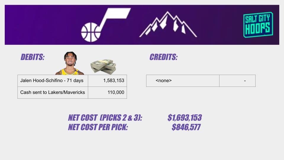 This time, Utah had to send the minimum amount of cash, $110,000 to its trade partners, satisfying the NBA rule that all sides must contribute something in a trade. Los Angeles and Dallas split the small sum, and the cost of these picks looked like this.
