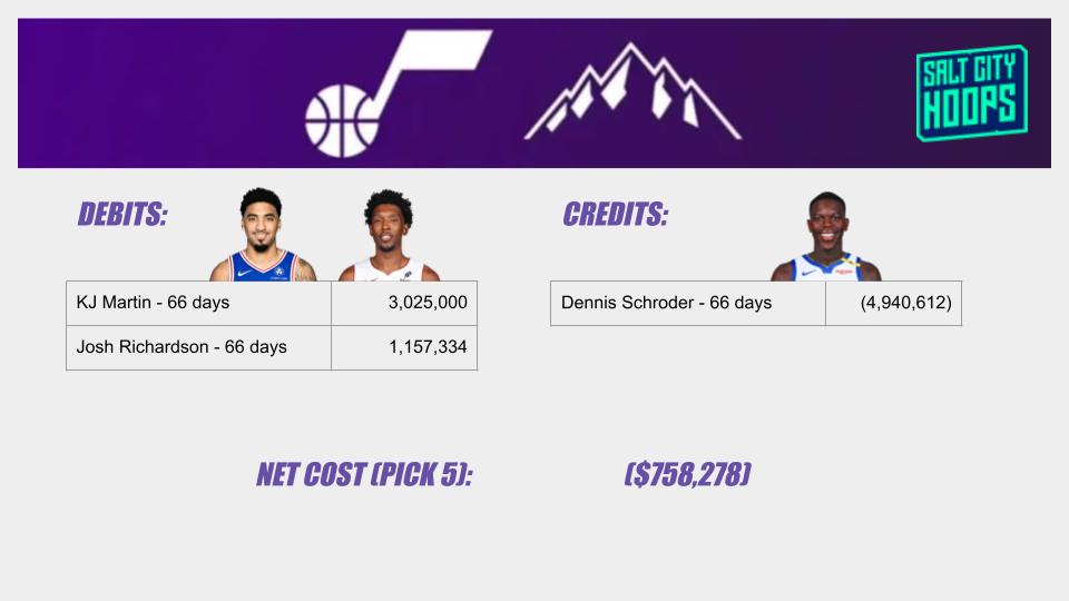 Utah actually saved money while adding the Schroder for Martin and Richardson transaction to the larger trade, but earned a second-round pick in the process, presumably because they weren’t just receiving dead or impaired salary, but providing a playoff hopeful with a legitimate rotation player.