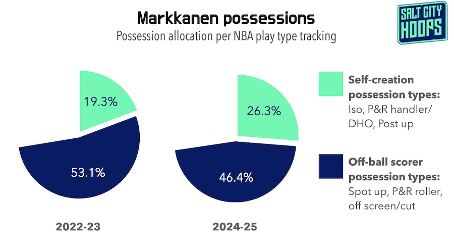 Play type tracking is pretty flawed, but the directional insight here is pretty interesting. In Lauri's first Jazz season — also his lone All-Star season — he was doing significantly more scoring in situations where the ball was given to him basically in time for him to use the possession: rolling, spotting up, cutting and popping off of screens. That's still a large part of how he scores, but the proportion has shifted and he's now 1.36 times more likely to score in a situation where he's really got the ball in his hands: iso, P&R handler (including DHOs) and post-ups.