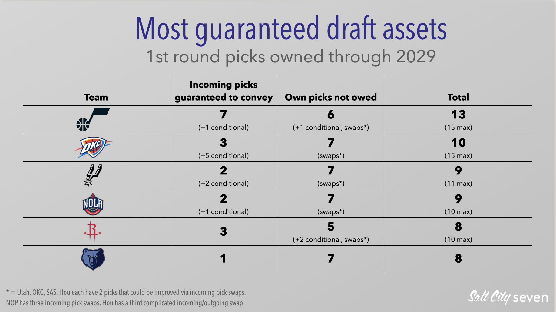For now, here's a reminder of how pretty the club is sitting when it comes to first-round assets. Nobody has more guaranteed first-round capital than Utah, which has sevent incoming picks guaranteed to convey plus at least six of their own selections.