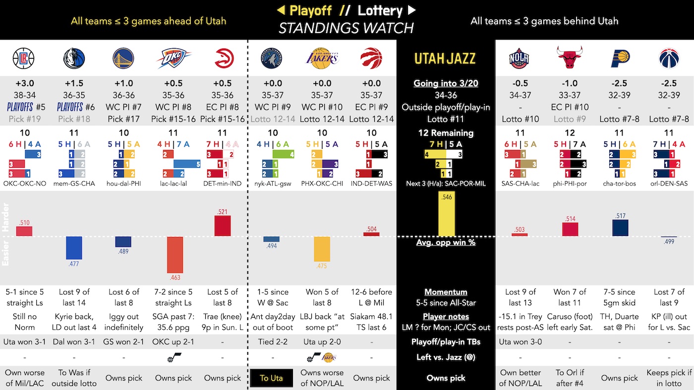 Wednesday 3/22, Jazz vs. Blazers: Tank-friendly Jazz fans must have this one circled, as it's probably the Jazz's last chance at "catching" Portland, losers of six straight and nine of their last 11. There is talk that the Blazers might shut Damian Lillard down soon if they don't start elevating towards a play-in spot, so their visit to Salt Lake is actually pretty vital. If they lose, the gap will be either 4 or 5 games (depending on Jazz-Kings), and it's hard to imagine a path to 10th or better. A win could bring Portland back to within two games of the Jazz, which might convince them to see if their subsequent 5-game homestand (Bulls, Thunder, Pels, then two against the Kings) keeps them in it. Jerami Grant missed Sunday's game, and that's been the problem for Portland all year: their top four scorers have appeared together in less than half of their games.