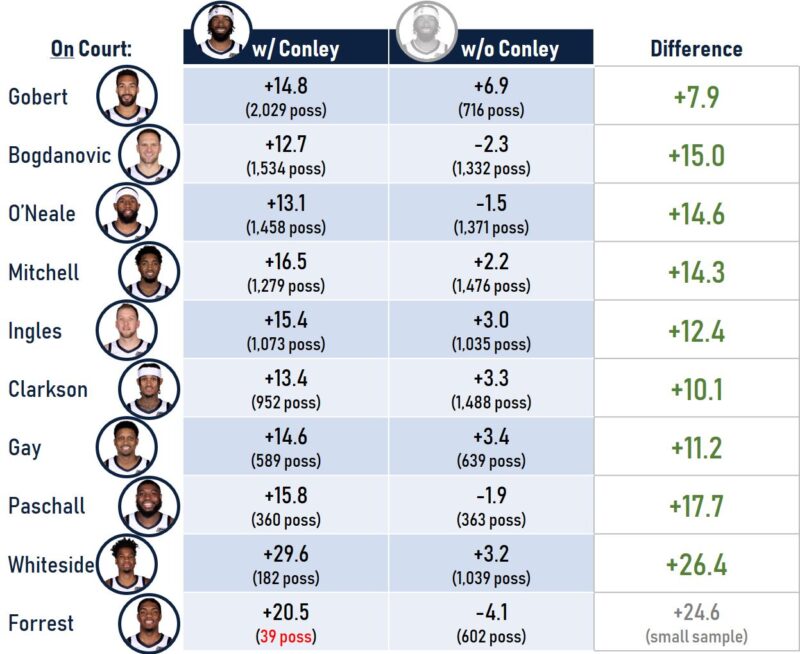Every single rotation player is significantly better next to Conley. In many cases, Conley is the difference between the Jazz being pretty decent and the Jazz being unstoppable.