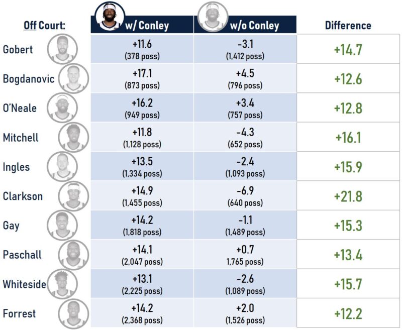 What's probably more impressive is that each player's OFF-court number also gets better with Conley playing.