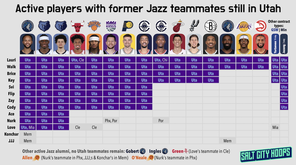 For example, when Mike Conley Jr. faces Utah this week, he will only see two former Jazz teammates[fn]And they'll both be in street clothes.[/fn], whereas his present-day colleague Kyle Anderson has shared a locker room with every current Jazzman on a standard contract.