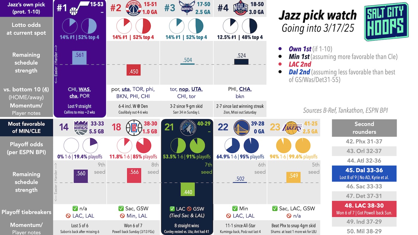 Utah has taken over the top pre-lottery draft position, but I keep insisting that they're probably fine anywhere in the top three. Those three teams will have equal odd at a top-4 pick. And sure, the worst record assured you a floor of the No. 5 pick, but in this particular draft I don't think the difference between 5th and 7th is as important as landing in the top 3-4, where Utah can only land as a result of ping pong ball bouncing.