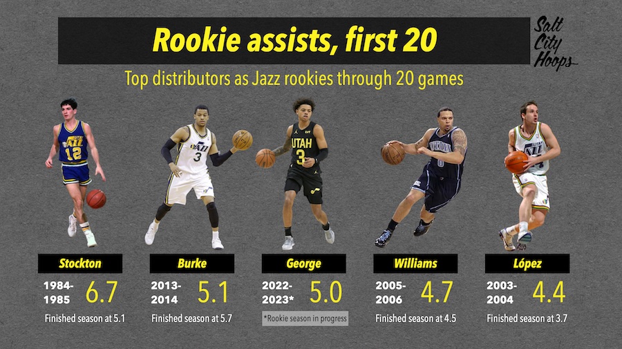 George has a non-zero chance at catching both John Stockton (5.1) and Trey Burke (5.7) for the most assists per game by a Jazz rookie ever, but let's not jump too far ahead. For now, it's impressive enough that the 20-year-old is keeping pace with the other four most prolific rookie passers in club history.