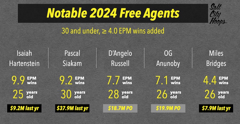Let's assume that Utah's ideal target isn't older than 30. Here's every pending unrestricted free agent (or player option) in that age range who had at least 4.0 EPM Wins Added last season.