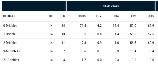 The numbers would also suggest that Markkanen is meant, at this time, to play off others, rather than create himself. His efficiency steadily declines the longer he has the basketball and the more dribbles he has to take. This season in 14 games, Markkanen is shooting an effective field goal percentage of 15% when he shoots after 3 dribbles or more. He's 7 feet tall and it's impossible to ask almost any 7 footer not named Kevin Durant to attack the basket off the dribble, but it also means he can get his shot off almost any time over defenders.
